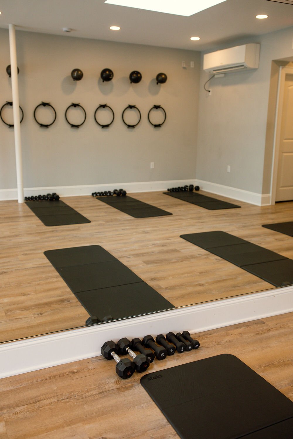 Bring water and grip socks for Lagree, Barre Burn, and Full Body Tone. For other classes, grip socks are recommended. We provide the equipment you’ll need for class.
